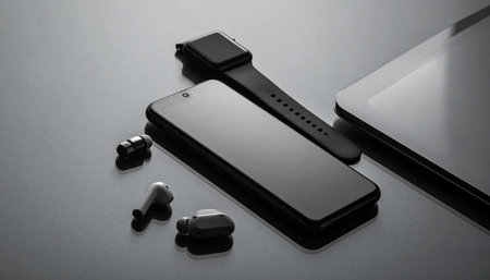 Contemporary mobile phone arrangement featuring earbuds, fitness tracker, pen, and adapter on a clean, neutral surface, bathed in soft sunlight.