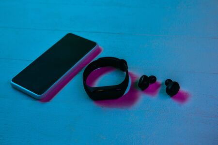 Top view of set of gadgets in purple neon light and blue background. Smartphone, smartwatch and wireless headphones on wooden table. Copyspace for your advertising. Tech, modern, gadgets.