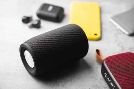 Modern power bank, smartwatch, earphones and mobile phone on gray background