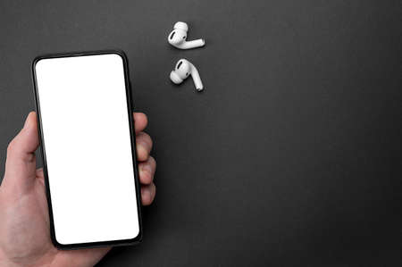 Mockup image. Hand hold cell smart mobile phone with blank white screen. White wireless earphones or headphones and smartphone over black background. Close up. Copy space.