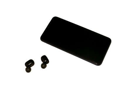 Black smartphone and wireless headphones isolated on a white with copyspace.