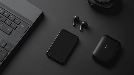 Minimalist desk setup with a blank smartphone screen next to wireless earbuds and a keyboard