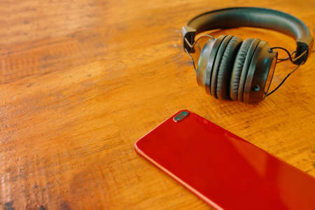 Black earphones and red mobile phone on wooden table. Wireless headphones and smartphone close-up. Copy space for text. Modern everyday gadgets. Concept of blogging, podcasting.