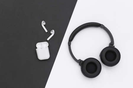Wireless large stereo headphones and small earbuds with charger case on black white background. top view