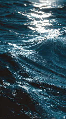 This image presents a close-up view of ocean waves under sunlight. The scene is dominated by shades of blue and white, with dynamic patterns of light reflecting on the water's surface. The composition suggests an open environment, with potential uses in various commercial and editorial contexts.