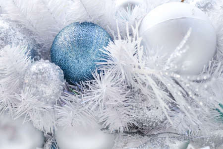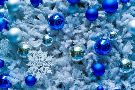christmas tree with white frosted snow style and blue and silver toned baubles decoration, shot at shalow depth of field
