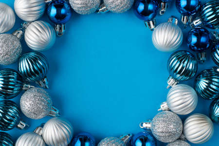 Blue and silver christmas decoration balls baubles on blue background with copy space. New year card. Minimalistic style. Flat lay.
