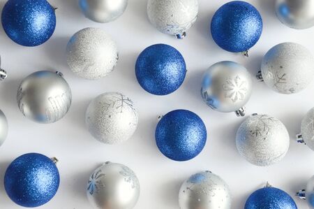 Gray and blue Christmas balls on white background. Preparation for the New year and Christmas. holiday decor. Waiting for the holiday.