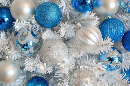 Closeup view of a white christmas tree decorated with blue and silver baubles