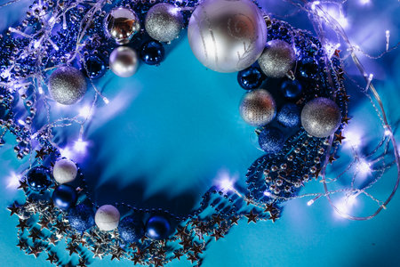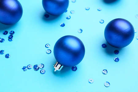 New years composition. Christmas blue and silver christmas tree decorations balls on a blue background. Flat lay, top view, copy space
