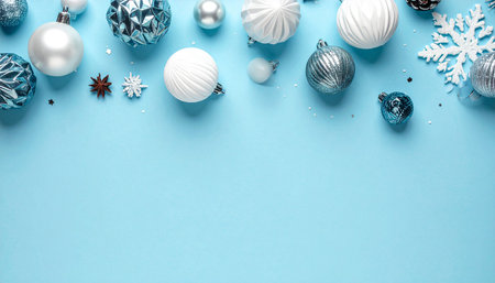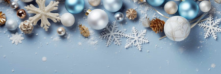 Blue and white Christmas ornaments and snowflakes are arranged along the edge of a light blue background with ample...