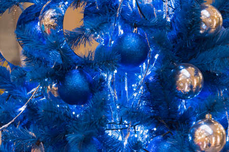 Beautiful background decorated Christmas tree with toy balls and garlands.The idea for postcards. Soft focus. Shallow DOF