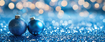 Christmas ornaments, holiday decorations, blue tones, bokeh background Two blue ornaments sitting on a sparkling surface, creating a festive atmosphere with shimmering lights