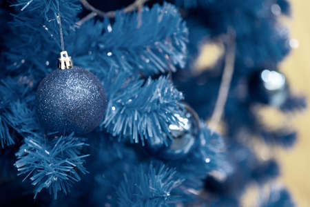 Blue ball hanging on a blue Christmas tree branch. Photo for Christmas winter background