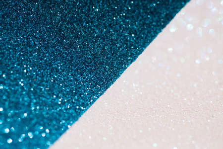 Blue glitter foil background. Shiny metal blue foil texture abstract defocused background. Sparkle glitter texture with bokeh lights.