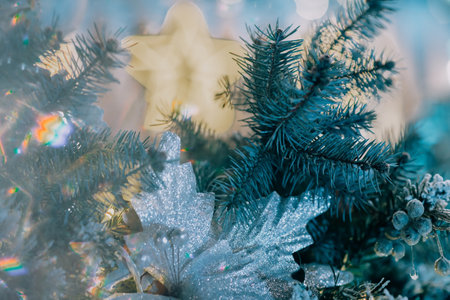 New Year atmosphere and aesthetic decorations. Christmas tree with festive ornaments. Silver flower and balls on green fir branches. Background for postcards and posters. Winter holidays.