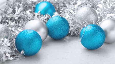 Christmas decorations.Shiny Christmas balls of blue, white and silver colors of different sizes on a turquoise background.