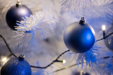 Closeup of beautiful shiny blue holiday baubles hanging on a white christmas tree with lights.