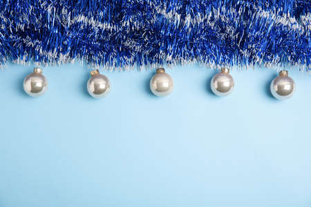Bright tinsel and Christmas balls on light blue background, flat lay. Space for text