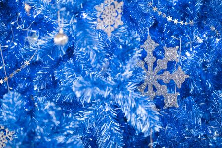 Christmas tree with silver New Year toys, blue and silver balls, glowing snowflakes.