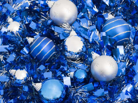 Close-up of shiny blue and silver glitter baubles used as Christmas tree decorations, showcasing festive holiday texture and seasonal elegance for design projects