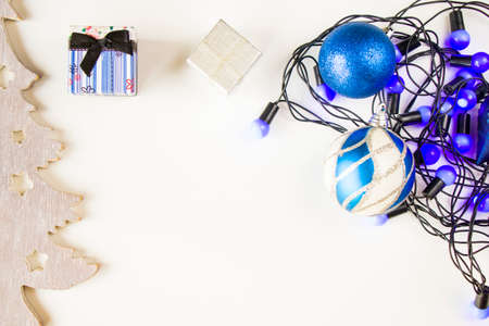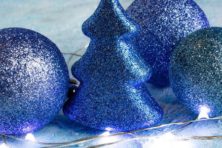 blue sparkling Christmas decorations - balls and a Christmas tree on a white and blue background, decor for New Year