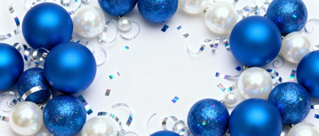 Shiny blue and white ornaments arranged in a festive circle with metallic ribbons and confetti on a white background.