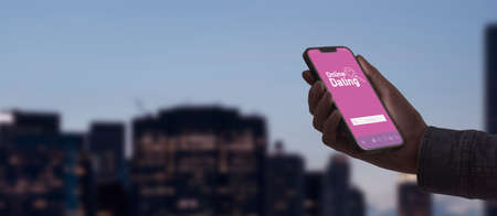 Woman holding a smartphone and using online dating apps, she is searching for a partner in her same city
