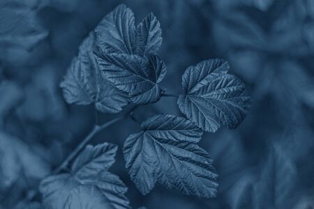 Closeup textured foliage toned in Classic Blue - color of the year 2020. Natural background with place for text.