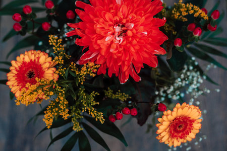 Colorful autumn flowers on dark background. Flat lay, top view