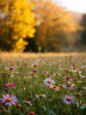 A breathtaking view of a vibrant wildflower field illuminated by warm sunset light. This stunning image captures the essence of nature's beauty and tranquility, perfect for outdoor and landscape photography enthusiasts.