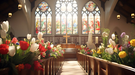 A panoramic shot of a grand church with tall wooden pews, Easter flowers adorning the altar, and soft light streaming through stained-glass windows.