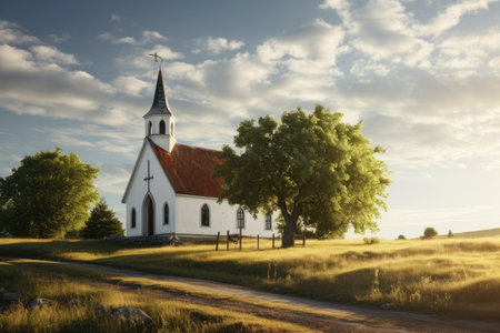 A charming white church sits peacefully amidst vibrant green trees, basking in warm sunlight. Its distinctive steeple and arched windows enhance its serene appearance.