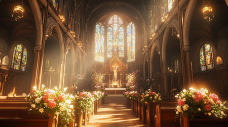 Sunlight pours through intricate stained glass windows, filling the beautiful church interior with an enchanting glow. The majestic space.