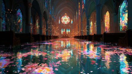A captivating view of a gothic cathedral interior with colorful stained glass windows. The serene atmosphere is enhanced by reflections in the calm water, carpeted with delicate floral petals. An enchanting scene of tranquility and beauty.