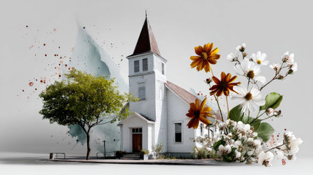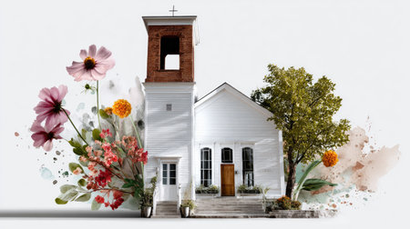 A serene white church set against a vibrant display of flowers and a soft watercolor background, evoking feelings of peace and tranquility. Perfect for concepts of faith and nature.