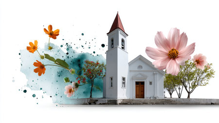 A charming white church stands elegantly amidst vibrant flowers and artistic watercolor elements, capturing the essence of spring's beauty and tranquility.