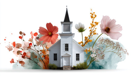 A picturesque white church nestled amid vibrant floral designs and soft watercolor accents, creating a serene and artistic atmosphere perfect for any project.