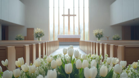 A serene church interior with wooden pews, a prominent cross, and a foreground of fresh white tulips and soft natural light.