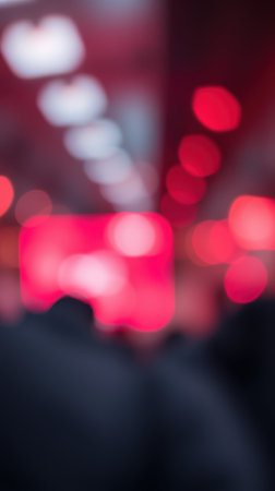 The image is a blurry, colorful scene of lights and people. The lights are scattered throughout the scene, creating a sense of movement and energy. The people are also blurred