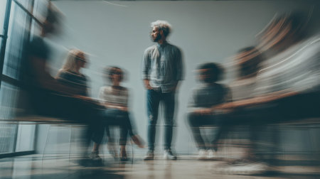 Team of startup members in a discussion, one person shows clear focus while others have motion blur, capturing the moment of decision making.