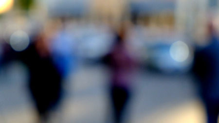 People walking down the street in the evening, beautiful light at sunset. The photo is purposely made out of focus, no faces are recognisible