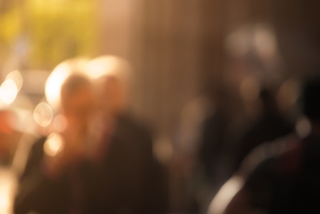 People walking down the street in the evening, beautiful light at sunset. The photo is purposely made out of focus, no faces are recognisible