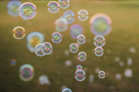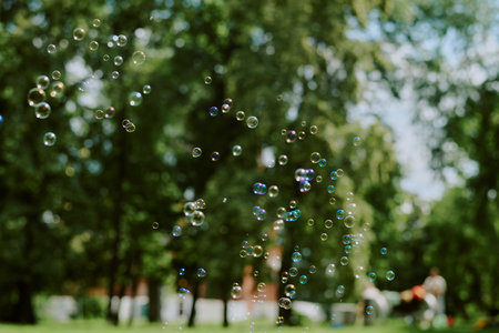 Colorful soap bubbles flying against blurred natural background. Sunny day.