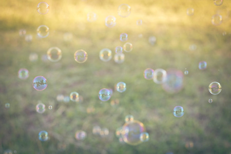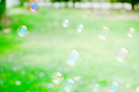 Abstract blurred of rainbow soap bubbles from the bubble blower flying on green grass. spring or summer season background. symbol of childhood. bokeh background