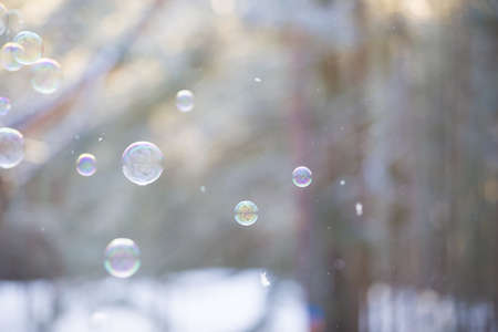 Soap bubles on sunny winter forest background. Holidays seasons. Outdoor