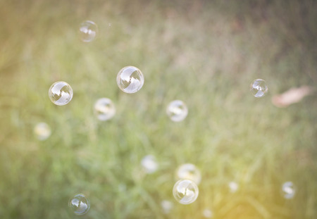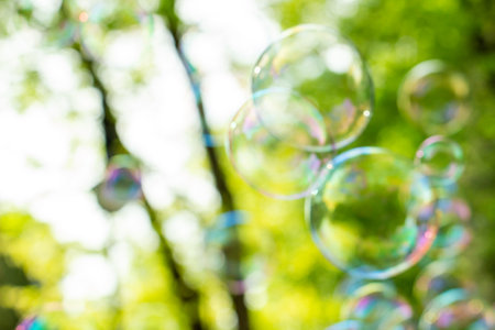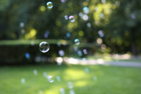 bright soap bubbles on summer natural green abstract background. many flying soap bubbles in sunny day. spring or summer season. symbol of childhood, purity, ecology