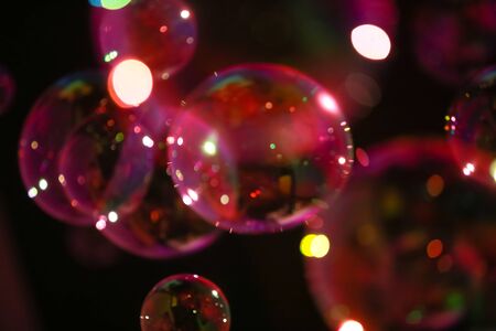 Many multicolored giant soap bubbles flying in the air on a windy day. Huge bubbles are stretching on the wind into long smoothy changing shape without popping. Close up. Copy space. Selective focus.
