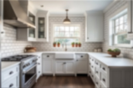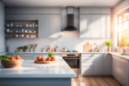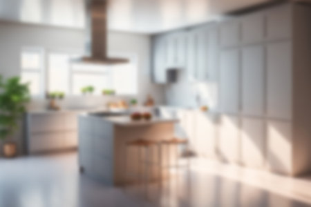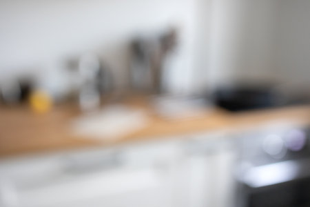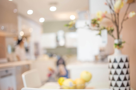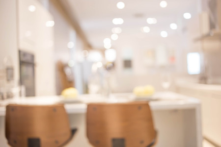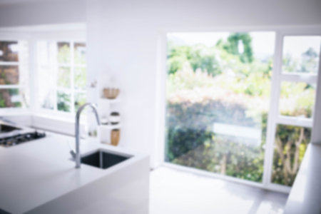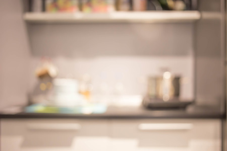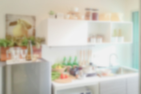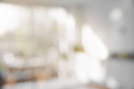 Abstract blurred image of kitchen room with soft light for background usage. Blur interior background concept. white tone.