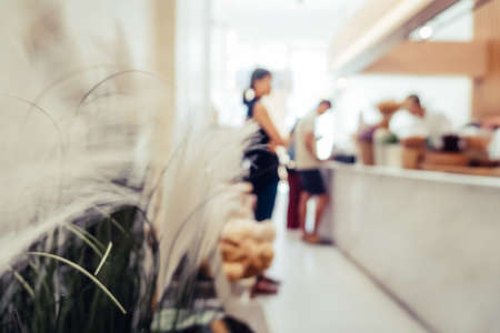 Blurred image inside a bright and beautifully decorated coffee shop.
